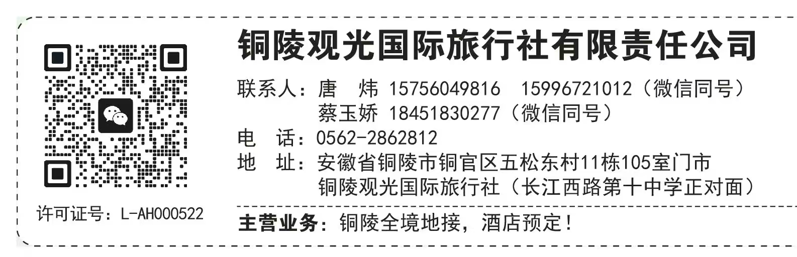 Copyright 安徽銅陵市觀(guān)光旅行社有限責(zé)任公司 地址: 安徽省銅陵市長(zhǎng)江西路第十中學(xué)正對(duì)面銅陵觀(guān)光國(guó)際旅行社(五松東村11棟105)